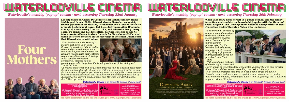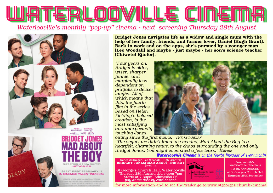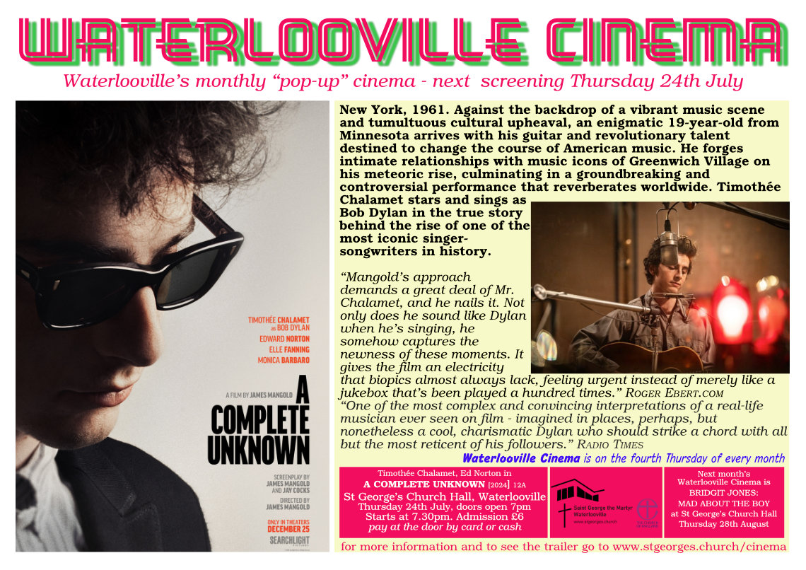Waterlooville Cinema is a monthly ‘pop-up’ cinema bringing the latest blockbuster films to the town on the 4th Thursday of every month. The next screening is on Thursday 18th December, doors open 7pm for a 7.30pm start. Tickets (on the door) £6. Pay by card or cash.