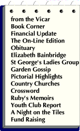 from the Vicar|Book Corner|Financial Update|The On-Line Edition|Obituary|Recital by Elizabeth Bainbridge| St George's Ladies Group|Garden Gossip|Pictorial HighlightsCountry Churches|CrosswordRuby's Memoirs|Youth Club Report|A Night on the Tiles|Fund Raising at St George's
