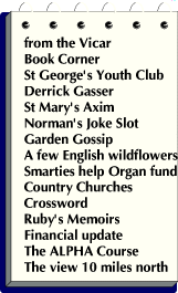 from the Vicar|Book Corner|St George's Youth Club|Derrick Gasser|St Mary's Axim|Norman's Joke Slot| Garden Gossip|A few English wildflowers|Smarties help the Organ fund!Country Churches|CrosswordRuby's Memoirs|Financial Update|The ALPHA Course|The View 10 miles further North