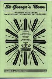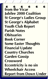 from the Vicar|Jubilee 2000 Coalition|St George's Ladies Group|St George's Alphabet|Youth Club Report|Parish Notes|Obituaries|Book Corner|Some Easter Thoughts|Ruby's Memoirs|Financial Update|Country Churches|Garden Gossip|Crossword|Eccentricity is no sin|Wheelchair Access|Report from Down Under
