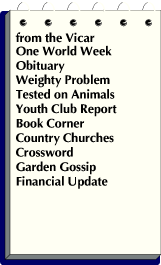 from the Vicar|One World Week|Obituary|Weighty Problem|Tested on Animals|Youth Club Report|Book Corner|Country Churches|Crossword / Crossnumber answer|Ruby's Memoirs|Garden Gossip|Financial Update|