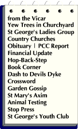 from the Vicar|Yew Trees in the Churchyard|St George's Ladies Group|Country Churches|Obituary|PCC Report|Financial Update|Hop-Back-Skip|Book Corner|Dash to Devils Dyke|Ruby's Memoirs|Crossword|Garden Gossip|St Mary's AximAnimal Testing||Stop Press|Youth Club|