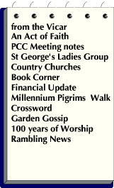 from the Vicar|An Act of Faith - 14th Century Style|PCC Meeting Notes|St George's Ladies Group|Country Churches|Book Corner|Financial Update|Millennium Pilgrims Trail Walk|Crossword|Ruby's Memoirs|Garden Gossip|Looking back on 100 Years of Worship|Rambling News