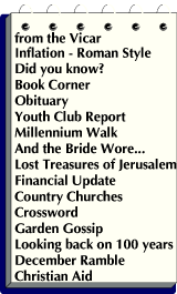 from the Vicar|Inflation - Roman Style|Did you know?|Book Corner|Obituary|Youth Club Report|Millennium Walk|And the Bride Wore...|The Lost Treasure of Jerusalem|Ruby's Memoirs|Financial Update|Country Churches|Crossword|Garden GossipLooking back on 100 Years of Worship|December Ramble|Christian Aid - Let there be light