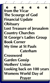 from the Vicar|The Scourge of God|Financial Update|Obituary|The Lost Treasure of Jerusalem|Country Churches|St George's Ladies Group|Book Corner|My Time at St Paul's Caterham|Ruby's Memoirs|Crossword|Garden Gossip|Mothers' Union|Looking back on 100 Years of WorshipWomens World Day of Prayer|