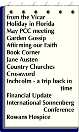 from the Vicar | Holiday in Florida | May PCC Meeting | Garden Gossip | Affirming our Faith | Book Corner | Jane Austen | Country Churches | Crossword | Ruby's Memoirs | Inchcolm - a trip back in time | Financial Update | International Sonnenberg Conference | Rowans Hospice