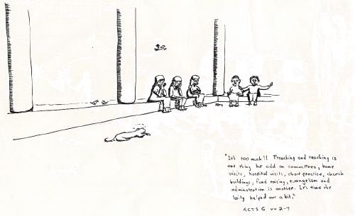 This was the title of a little book given to me by a former Bishop of Portsmouth. How true, for as a very young curate, I came across my vicar on his knees, not praying, but repairing the floor of the lavatory in the hall, for fear that one of the youth club should fall through. He commented, 'You do a lot of deaconing in this job'. It may not always be realised that most priests spend a year as a deacon befor ebeing ordained priest. So it becomes a juggling act, which comes first? The early church decided that a clear distinction be made between the two callings. We could go further as the cartoon suggests. (Acts 6, vv.2-7). Arthur Green