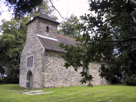 This small 11th century church of Burton, once known as Bodecton or Bodeton, lies well away from the main road in the spacious grounds of Burton Park near the village of Duncton. Close by is a private school but otherwise the church stands in splendid isolation. It has no dedication. Entrance is by the west door under the square belfry tower. Inside, the red brick floor and plain white washed walls appear somewhat ordinary but closer inspection soon reveals numerous brasses, two canopied tombs of the 16th century as well as a very unusual wall painting. The fifteenth century screen dividing the nave from the chancel still bears traces of the original coloured decoration as well as a tiny rood loft only two feet wide. Painted above are the Ten Commandments. The chancel itself has a plain glass east window and only a small wooden table as an altar. In the chancel floor are three large black marble slabs commemorating William Goring (1723), Henry Goring (1683), John Biddulff (1720) and his wife Mary. In the recess of the south wall of the chancel is a low altar tomb. Though partly mutilated it shows a lady in a low cut dress, her head on a cushion and a dog at her feet. Three quatrefoils with blank shields decorate the plinth. The tomb is late 15th century and probably relates to the Dawtrey family who then owned Burton. Also in the south wall is a small piscina with an oblique drain. The south wall of the nave displays three 17th century brasses of Henry Goring d.1671, his daughter Ann Biddulph who 'changed her life for a better' on 25 October 1679, and Mary Goring d.1694. In the centre of the south wall is an altar tomb of John Goring who died in 1520. He is shown on a brass wearing mail and plate armour kneeling at a prayer desk. Shields of arms relating to the Goring and Dyke families are also displayed. High above a blocked round headed doorway c.1075 is a fine painting of the Royal Arms of Charles I dated 1636. Above is painted the text "Obey them that rule over you" (Hebrews 13.7) and below the motto 'Christo auspice regno'. At the west end is a tub shaped medieval font, one of the earliest to be found in Sussex. Hanging above are two large funeral hatchments relating to the Biddulph family showing an eagle displayed argent. The north wall of the nave is dominated by a massive Elizabethan altar tomb with a canopy of Purbeck marble, in honour of Sir William Goring (d.1553) and his wife Elizabeth (d.1538). The figure of Sir William is missing but a brass of Elizabeth shows her in a long full skirt, a cap, veil and tight fitting sleeves. There were originally 20 brasses on the tomb, many commemorating their eight children, but some are now missing. Others show the family crest. Just above this tomb is a very unusual painting on the eastern splay of the north wall window partly hidden by the tomb canopy. Dating from the 16th century it shows a young woman with a mass of red hair tied upside down to a St Andrew's Cross. Some believe this to be a version of the St Wilgeforte legend. She was reputed to be the daughter of a heathen French king vowed to virginity. When ordered to marry she prayed to become unattractive. By a miracle she grew a beard and was put to death by her father. Also on the north wall are painted various Biblical verses in 'black letter' based on Titus 2 11-13, Hebrews 12.28 and 2 Corinthians 3.20. On the south wall is another text from Psalm 96. There is only one bell in the squat belfry. The nave, only 29 feet long, has a boarded roof. All the nave windows have two rectangular lights in plain glass. The outside walls are of rubble with large quantities of ironstone. Despite the paucity of parishioners, regular Sunday services are still held in the church and long may that continue. JOHN SYMONDS |
