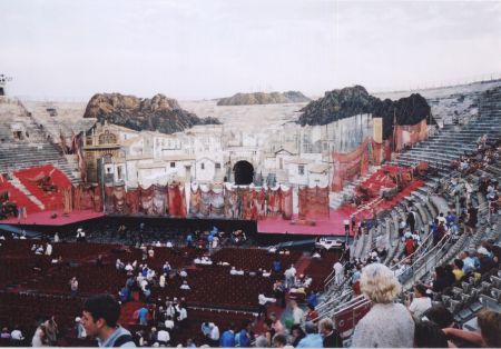 As the opera had started, the only thing that we could do was to wait, as 'tradition' demands that the show will recommence once the rain stops. The largest proportion of the audience had come into Verona on coaches which were parked on the outskirts of the city and would not leave until the designated time, or until and unless it became evident that the opera would have to be abandoned. Our tour guide had told us earlier that she had once attended an opera here when it did not finish until 3.am.! On Friday 28th June the delay proved to be about one hour; half an hour of pouring rain and half an hour while the scene shifters cleared the stage area; including using enormous squeegees to get some of the water out of the carpeted front of the stage. When the final applause sounded, I think that we were all applauding ourselves as much as the musicians and singers. What a contrast on Saturday 29th when we watched Franco Zefferelli's new production of Verdi's Aida staged under a clear starry sky. Such an imaginative setting and such superb singing left one breathless and made the whole trip worthwhile. I have been to Verona before, but I think my experience in June 2002 will be the one that comes to mind most, the contrast between the ridiculous and the sublime. WINIFRED MANCZ |