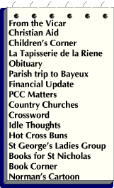 La Tapisserie de la Reine Mathilde |Obituary | Parish trip to Bayeux | Financial Update |PCC Matters |Country Churches | Ruby's Memoirs |Crossword | Idle Thoughts |Hot Cross Buns | St George's Ladies Group | Books for St Nicholas Seminary |Book Corner | Norman's Cartoon