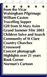 St George's Travelling Supper |Gift from St Mary Axim | Grand Summer Fete 2003 | Children solve and search |Community of St Clare |Country Churches | Ruby's Memoirs |Crossword | Concert photograph |Highlights over 21 years | Book Corner | Norman's Cartoon