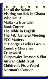 Malta - a true tale! |Book Corner | The Bible in English | The MU General Meeting 2003 |PCC Matters |St George's Ladies Group | Ruby's Memoirs |Country Churches | Crossword |Gunpowder Treason & Plot | African Child Trust | Childrens Fix a Word | Norman's cartoon