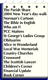 The Bible in English |Who am I? | PCC Matters | St George's Ladies Group |Obituaries |Alice in Wonderland | Ruby's Memoirs |Local War Memorials | Country Churches|Crossword|The Scottish Lawyer|Children's Corner |Financial Update|Book Corner