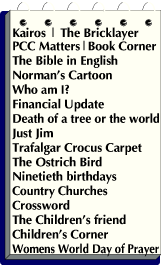Book Corner |The Bible in English | Norman's Cartoon | Who am I? |Financial Update |Death of a Tree or the World | Ruby's Memoirs |Just Jim | Trafalgar Crocus Carpet |The Ostrich Bird |Ninetieth Birthdays |Country Churches |Crossword|Edward Rudolf, the Children's Friend |Children's Corner|Womens World Day of Prayer