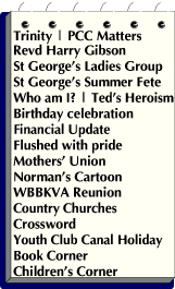St George's Ladies Group | St George's Summer Fete | Who am I? | Ted's Heroism | Birthday celebration | Financial Updates | Ruby's Memoirs | Flushed with pride | Mothers' Union | Norman's Cartoon | WBBKVA Reunion | Country Churches | Crossword | Youth Club Canal Boat Holiday | Book Corner | Children's Corner