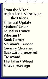 Mothers' Union | Found in France | Who am I? | Book Corner | Norman's Cartoon | Country Churches | Ruby's Memoirs | Children's Backward Crossword | Crossword | The Falkirk Wheel | Fifteen years ago