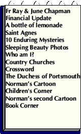 Saint Agnes |10 of the world's most enduring mysteries | Sleeping Beauty photo gallery | Who am I? |Country Churches |Crossword | Ruby's Memoirs |The first (and only) Duchess of Portsmouth | Norman's cartoon|Children's corner|Norman's second cartoon|Book Corner