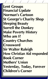 St George's Charity Shop |Sleeping Beauty | Sorrell the Donkey | Make Poverty History |Who am I? |Country Churches | Ruby's Memoirs |Crossword | Sir Walter Raleigh | How Christian Aid responded | Book Corner | Mothers' Union | Yesterday, Today, Forever | Children's Corner