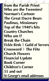 The Great Dacre Bears |Paulinus Missionary | Top of the 1940's Pops | Country Churches |Who am I? |Break the Chain | Ruby's Memoirs |Fickle Birds | Guild of Servers | Crossword | The Fete | Church Flowers| Financial Update| Book Corner| Children's Corner| 55 and out| St George's email addresses