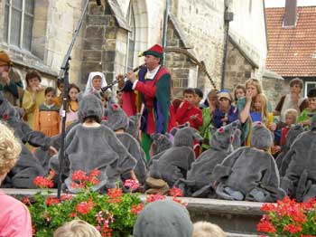 Pied Piper in Hameln In Germany our first stop was Hameln, of the Pied Piper story, once again a lovely little town where they made the most of it to increase tourism, with shows acting out the story using the town’s people as the cast and the children were playing the part of the rats. The stage was set up in the town square most days; we spent three nights there so as not to miss anything of interest including a river cruise, even the boat and the bridge over the river had rats on them, all in the best possible taste. Once again architecture from the Weser Renaissance period was lovely, such splendidly decorated houses in tight rows along the main street, with all the tables set out in the street where it was nice to sit and have a drink or two with something to eat under the sun shades, all so clean, no rubbish littering the street, why? Can we not be as clean and tidy in this country, is it a lack of pride in our own towns or just laziness, probably a mixture of both. We came across a band playing in the town park, they were fantastic! Then we spent several hours just listening to them, they were not paid, just came out on nice sunny days for enjoyment and practice. We certainly enjoyed listening to them! The weather was beautifully sunny; all we needed was a picnic for a perfect afternoon.