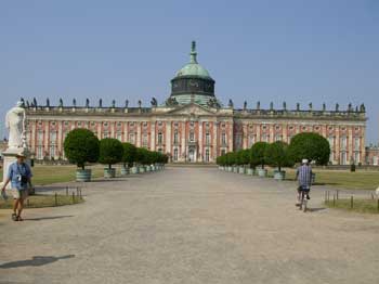Sanssouci Palace, Potsdam On leaving Hameln we headed for Potsdam which is about eighteen miles outside of Berlin, as there was a camp site with convenient bus and tram services to Berlin. Potsdam itself was the centre of historic Prussia, ruled by the likes of Frederick William 1st (Soldier King) and Frederick the Great. First we went to see the Schloss Sanssouci which is like a very large stately home with parks and gardens with many interesting features including a Chinese tea house and working windmill, the grounds were so extensive we managed to get lost, but then I am good at that. The next day we got the tram to Berlin and did the bus tour around the city, taking in many points of interest including the remains of the Berlin wall, Check Point Charlie, Brandenburg Gate and so many so other places it would fill the page to mention them all, but what I thought was very poignant was the tower of a bombed out church in the centre of town which had been left in this state, serving as a reminder! I found it hard to imagine Berlin as it was at the end of hostilities although I have seen pictures of it in complete ruins. Christine Culley |