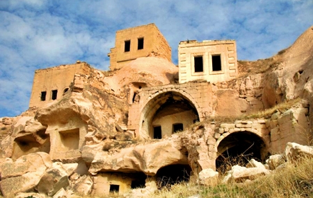 After lunch on our third day (1st in Goreme, Central Turkey) we went north to the village of Cavusin, which had suffered from an earthquake in 1963. As it was riddled with a large number of cave dwellings, which had been excavated from the steep valley sides, part of the village had collapsed burying houses and inhabitants. Our guide refused to take us further into the village but a local man led those of us who were game for the adventure, on a steep walk past the damaged dwellings up to the plateau above the village. From there we crossed over a rickety wooden bridge to the 5th century church of St John the Baptist with its frescoes high up in the cliff wall. In 1975 the entrance caved in and so we were only able to view the side chapel. We returned as intrepid adventurers to the village centre, for apple tea, before moving on to Guvercinlik. It is here in the ‘Pigeon Valley’ that the caves are used as pigeon lofts for the collection of their droppings, for use as fertiliser.