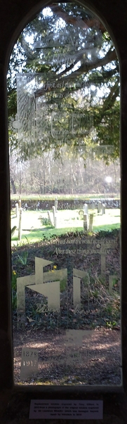 The small lancet window was one of a pair, beautifully engraved in the 1970s by a distinguished engraver, Sir Laurence Whistler. They were precious to the church and to the village, being dedicated to the life of Edward Thomas, a local poet. The left-hand window showed Thomas as a vagabond image and there was a landscape behind. The damaged right-hand window contains one of his poems, ‘The New House’; the house, once occupied by him is depicted and behind the lines of the poem are doors - some open and others closed. From the final open door can be seen a battlefield in Flanders. Thomas, a soldier in the First World War, was tragically killed at Arras in Spring 1917.