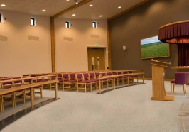 The Service Hall is non-denominational but a cross or other religious symbol can be displayed. A floor to ceiling window overlooks a planted courtyard and the woodland. There is a state of the art media system with a screen for audiovisual playback so that pictures, images or a video pertaining to the deceased can be shown. Should there be too many mourners to fit into the Service Hall the screen in the waiting room can relay the same images and music. A vast selection of music and hymns can be played. The service can be recorded, and a live web-cast produced. Terry demonstrated a hymn played on the digital organ and the sound was indistinguishable from a real organ.