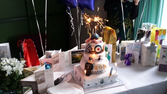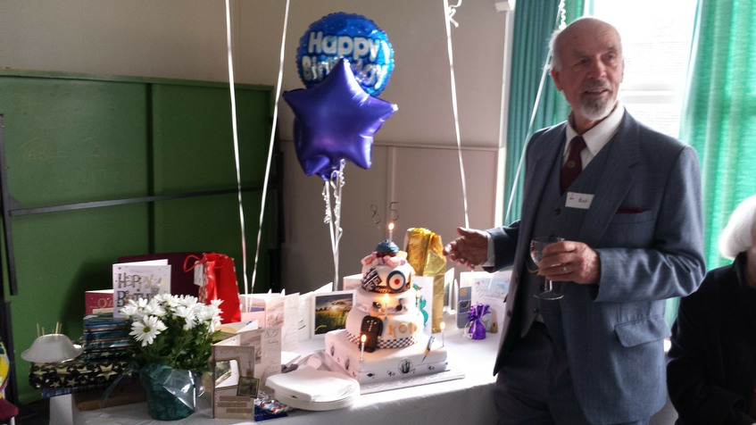 Rod on the occasion of his 85th birthday, with a magnificent birthday cake depicting highlights of his varied life, from working with film makers Metro Goldwyn Mayer, service with the RAF, a policeman (rising to rank of Superintendent), and a lecturer at Portsmouth Polytechnic (now Portsmouth University), collecting on the way degrees and qualifications in a wide range of subjects including in Sociology, Law, Bookkeeping and Music. As well as regularly contributing articles to St George’s News and designing the front covers, he is an expert in Calligraphy and continues to teach the subject.