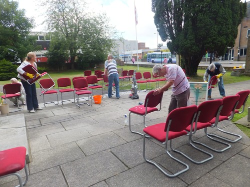 The cost has been met by the Waterlooville Music Festival, and a working party got together to clean them up (photo below) as a result of which the chairs are now in ‘as new’ condition.