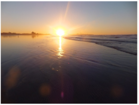 The next day we had coffee in the old Fire Station in Hokitika while we waited for the museum to open. The museum has a good display about the gold mining in the area and makes the most of the connection with the prize winning book by Eleanor Catton – The Luminaries. I had read this on my Kindle and hadn’t realised what an epic it was until I saw the size of the book in the museum shop! I might not have started it if I had known. It is an excellent, if complex, novel and I was pleased that the lady at the desk agreed that the writer’s other book had been a confusing disappointment. We hit the road again, crossing the rather scary bridge that has the railway down the middle of the road, and headed on to Greymouth for another taste of Whitebait patties at Speight’s Ale House. (Up for sale if anyone fancies owning a pub!) On up the coast we revisited the Pancake Rocks and were rewarded with wonderful rainbows and surges through the blow holes as the tide was right for the full effect. The beaches and rolling waves were beautiful all the way up the coast and the roadsides orange with Mombretia in full flower. We settled in to the camp site by the beach at Westport and followed the advice to be on the beach at sunset. It was fabulous!