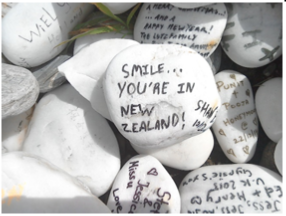 The following day we found ourselves in rain again – though it was still warm enough for jandles (kiwi for flip flops!) This meant that breakfast at a pavement café on the lakeside was not an option so we set off north. Lake Hawea wasn’t its perfect blue self (fortunately we experienced that last time) but the waterfalls along the way through the Haast Pass were subsequently fabulous. We stopped for Whitebait patties at lunchtime in Haast and then continued up the west coast, stopping to write on a white stone to add to the collection at Bruce Bay, but escaping as quickly as possible to avoid being eaten alive by the dreaded sand flies. The weather was clearing and the helicopters flying over Mount Cook from Fox Glacier. By the time we reached Franz Joseph it was fine and T shirt weather for a walk up to the glacier. The Rain Forest camp site is lovely once you are away from the hostel area where two Contiki coach trips (club 18 – 30) were settling in for a “Tight and Bright” party night at the bar. Being too old for that, we stayed “home” and enjoyed more Kiwi wine amongst the tree ferns.