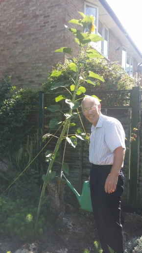 Glynn Ross tending to Andrew Clark’s magnificent sunflower which won the 2015 Summer Fête Sunflower Competition.
