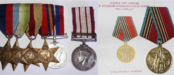 Bert’s medals include the 1939-45 Star, Africa Star, Atlantic Star, Burma Star, the Indian Imperial Star, Palestine 1945-48 and on the right the Russian general service medal.