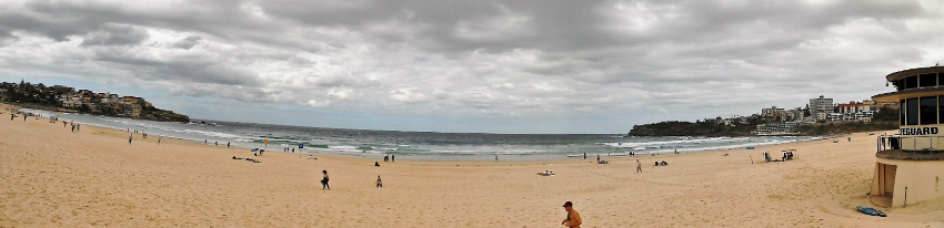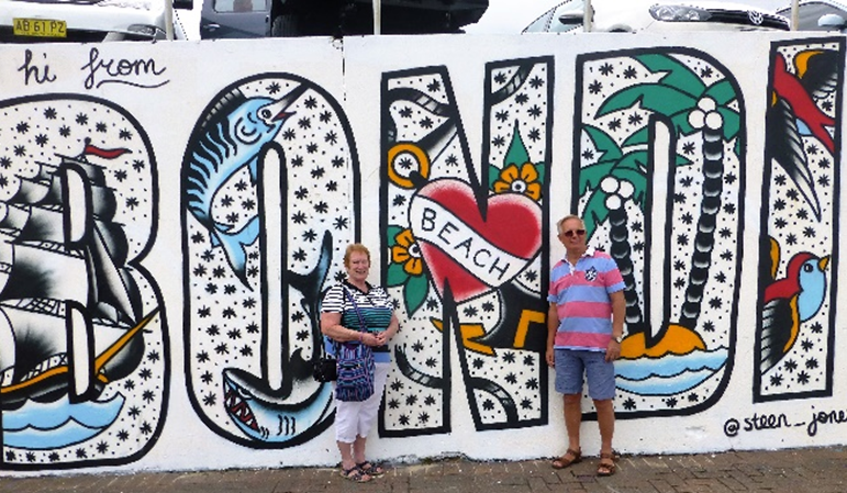 Leaving our bags at the hotel the next morning, we took the train and bus out to Bondi Beach. We have to admit to being a bit disappointed as it wasn’t quite the wild, huge surfing beach we had imagined. For Sydney city dwellers it is a wonderful doorstep facility and the home of TV Lifeguard reality/drama. There was no drama when we were there but they were filming on the beach near the lifeguard station. We walked along the coastal path round a couple of bays to Bronte Beach for lunch, admiring the beaches and rock formations along the way.