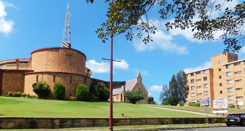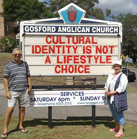 After our Blue Mountain trip we spent a day exploring Gosford and the waterfront, complete with pelicans that sit on the lampposts! We discovered St Mary’s Church, a modern “in the round” building next to the original small church which is now used as a wedding venue. St Mary’s is the home of Fr Rod Bower, author of the, sometimes controversial, signs outside the church that have become famous worldwide. The sign at the time is below.
