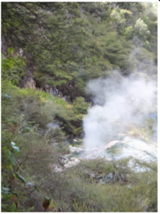 The following day we set off early, in lovely sunshine, and headed southward to the Waimangu (Black Water) Volcanic valley. This is an interesting place as it is the only hydrothermal system in the world formed within historic times. It was created in 1886 as a result of the Tarawera Eruption when Mount Tarawera erupted, leaving a chasm 4 miles long and 820ft deep and burying the famous Pink and White fan-like silica terraces which were acknowledged as the 8th wonder of the world. Several Maori villages disappeared under mud flows and 153 people were killed. A thriving tourist attraction, including a hotel, were wiped out in 1917 by an eruption that formed the Frying Pan Lake – the world’s largest hot water spring. Today one can take a 90 minute, 4k walk through the area, admiring hot springs, mini geysers and silica fans forming on the way to Lake Rotomahana – formed in the eruption and covering the Pink and White terraces. As an added bonus there is a shuttle bus that will return you to the car park.