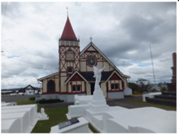 The next morning we headed into town and explored the Thermal Park – minimal health and safety, just common sense and a few warning signs – and saw steaming pools and bubbling mud. After lunch we discovered St Faith’s Anglican Church, built on a peninsular known as Muruika that juts into Lake Rotorua. On the site of a heavily fortified Maori pa, the peninsula was the burial ground for ancestors. The steamy, bubbling pools around here remind us that the area is unstable and that the last palisades of the pa disappeared into the lake in the 1960’s. Invited by the local chief, two missionaries were invited to the area and the first Christian service was held here in 1831. Much work was done to teach literacy and put the Gospel and business papers, including the Treaty of Waitangi, into Maori. The first church was built of Kauri wood in 1885. Ihaia Te Ahu, a local tribesman who grew up at Kerikeri (Bay of Islands) with the lay missionaries, was appointed the first vicar. He was known as “the hero of missionary effort” in Rotorua.