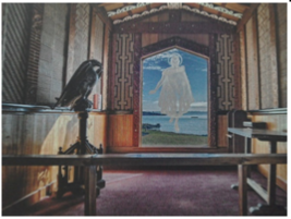 The current church on this site was dedicated in 1914 and was designed to be in keeping with other buildings in the town – with Gothic/Victorian tower and a rather Elizabethan looking exterior. The inside is beautifully decorated in the Maori style with fabulous carving and geometric woven panels of tukutuku. The Sanctuary window shows Christ knocking on a door – a reproduction of the Holman Hunt painting, The Light of the World. The whole place is a wonderful mix of Maori and European styles. The original wooden church was moved next door and served as a Sunday School until it was blown down in a storm in 1936. In the 1960’s the church was extended to accommodate larger congregations and east and west chapels added. The Galilee chapel is home to the most beautiful window. A plain glass window is etched with the image of Jesus wearing a Maori korowai (cloak) appearing to walk on the waters of the lake.
