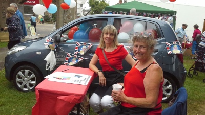 Fete day dawned rather grey and drizzly but a decision was made and we set up our stalls outside in the Church gardens. As well as the usual stalls and games we had borrowed a car from Clarks Autos and filled it with balloons with a prize for guessing how many we had managed to cram in - the answer was 178 (I was miles out).