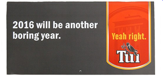 Further up the road was a far greater attraction – the Tui brewery at Mangatainoka. Having enjoyed scones with our coffee we weren’t able to indulge in lunch here but it would have been rude not to try the beer. Tui is renowned for its beer and ironic “Yeah right” adverts which often reflect current news stories. One church “borrowed” the idea for an “Atheists have nothing to worry about – Yeah right!” poster but was threatened with legal action.