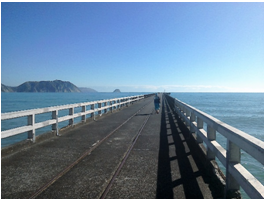 Gisborne was our next port of call and we discovered where all the wood on the logging lorries finished up. The wharf was huge and wood everywhere. Gisborne is also the site of one of the first Maori landings and Captain Cook’s landing in 1769. He named it Poverty Bay as the locals weren’t friendly and he had to leave without the supplies he needed. The memorial at Kaiti Beach recounts the events and was paid for by all the school children of New Zealand paying 1d each. The Pacific Coast Highway continued to wind its way through scenic reserves with views across the ocean and took us to Tolaga Bay camp site. There is very little at Tolaga Bay but, as Lonely Planet says, “this is a place where absence becomes substance.” It is famous for having the longest wharf in the southern hemisphere. Built in 1929 to help keep the logging industry alive in the area, it is 660m long and enabled larger ships to berth in the shallow bay. It is being saved by local fundraising so we used it for our morning exercise the next day in glorious sunshine.