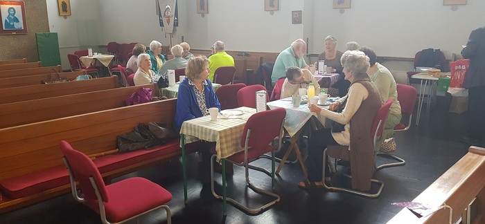 After much discussion our serving area has found a home by the statue of St George and new square folding tables have been purchased specially, to be used with the red chairs already stored in the church, with check cotton table cloths completing the transformation.