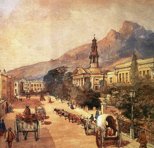 Sunday Dec 26th. We went ashore this morning with Captain and Mrs B.W attended service at the Cathedral (St Georges) – which is a plain oblong apartment more like a dissenting Chapel than a Church. It stands at the end of a street, showing what should be its west point, which boasts of an ionic Portico and a tower and bears a distinct resemblance to the Church in London called the “E???????”(#2). There are no aisles or chancel – it is simply a large room – the east end occupied by a gallery, the organ, vestry etc. and the Altar projecting in front of these excrescures (#3) as Pugin (#4) would have called them. The Dean read the prayers and one of the Bishop’s Chaplains preached. The Bishop resided some 10 or 12 miles from Cape Town and the Canons, of whom there are 8 or 10, attend his Church. It was difficult to imagine oneself in Africa! The congregation was thoroughly English, in fact quite a London congregation. I did not see more than half a dozen Hottentots in the Church.