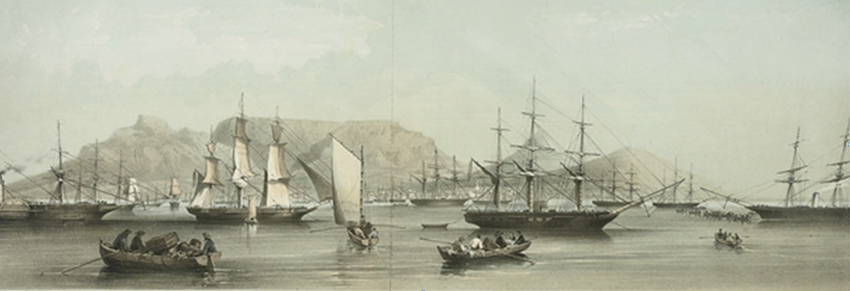 After service we went to procure lodgings for Captain and Mrs Bouchier who will remain ashore during the coaling. The population of Cape Town consists of about 25,000 English, Dutch, Hottentots and mixed races – about one third are English. The newest parts of the Town are beginning to put on a very English appearance – The streets are very wide and some of the best have capital foot pavements. It is much warmer on shore than at sea. We had fortunately taken our umbrellas and were very glad of them to keep off the sun. The ground is everywhere covered with a fine sand yellow and red in colour and the glare of the sun upon it is quite blinding. There is a fine market square and also a large square called the Parade Ground, with a handsome building containing a Corn Exchange and Public Library in the centre of it. The Captain soon obtained lodgings and we left shore at 3 o’clock. About this time a merchant vessel from Calcutta, the “Walmer Castle”, entered the Bay. She cast anchor near us and on signalling each other our chief officer (Mr Munro) found that the Captain is an old friend of his. A party of our officers immediately paid them a visit and exchanged newspapers. They had been some time knocking about and had entered two hurricanes on their way from Calcutta. They had not heard of the Duke of Wellington’s death.