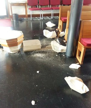 The historic font that has served for the Baptism of so many people in Waterlooville over the years, photographed after the mindless attack by vandals on Friday 21st April. If you have any information as to who may have been responsible, please contact the Police immediately.