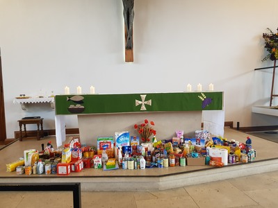 At our Harvest Festival Thanksgiving Service on Sunday morning 7th October a large selection of food, cleaning and toiletries items were collected together on the altar steps and later distributed between the Two Saints Centre Fareham and Waterlooville Food Bank. After the service we enjoyed a “bring and share” parish harvest lunch in the church hall.
