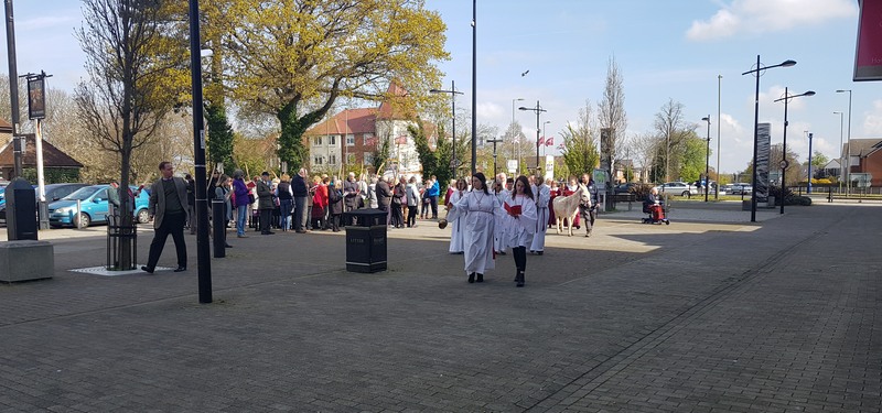 Sunday 14th April, Palm Sunday, was extra busy at St George’s. We met outside the Heroes Pub, processed with Priests, Servers, Choir and Band, plus a donkey who we had “borrowed” from the Donkey Sanctuary at Hayling Island.