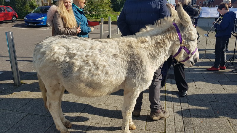 Bertie enjoyed a breakfast of carrots before we set off down the Precinct. He surprised us by joining in the hymns - whether he was enjoying the singing or objecting and this was “donkey speak” for “please be quiet!” I’m not sure.