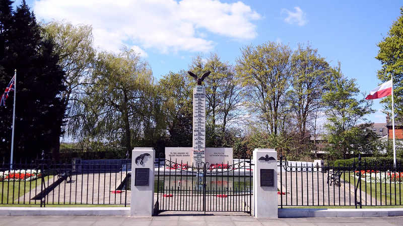 A column of Portland stone is surmounted by a bronze eagle. It commemorates 2,165 Polish airmen killed serving in the RAF. Their names, plus squadron badges, are inscribed on a wall alongside. The memorial was dedicated and unveiled by Lord Tedder (Chief of Air Staff) on 2 November 1948.